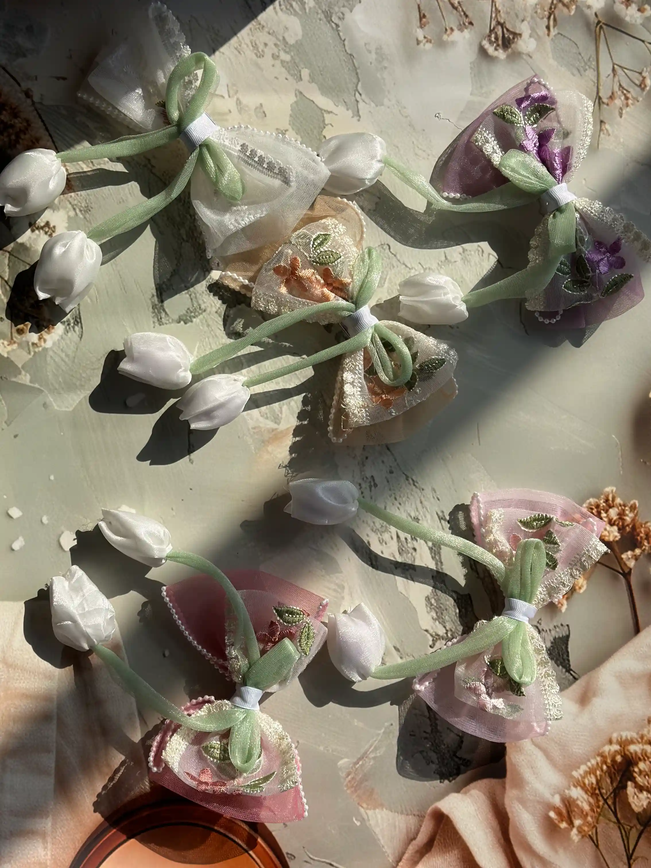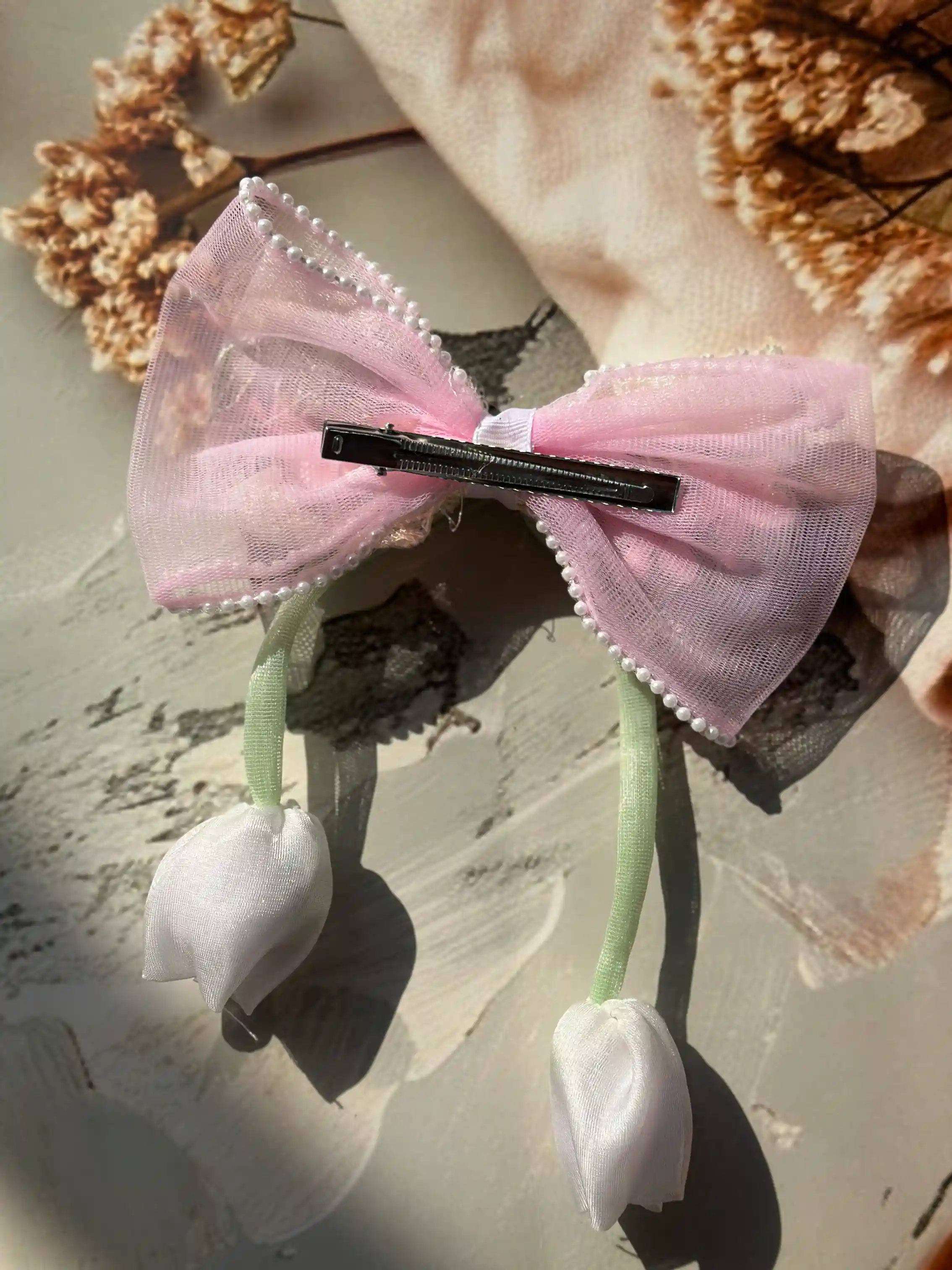 Delicately crafted for a soft, romantic finish, the Tulip Tie Bow Hair Clip features a sheer embroidered bow paired with graceful tulip-inspired fabric drops. Designed to move gently with your hair, this piece adds an elegant, feminine charm to half-up styles, low ponytails, or statement back clips.